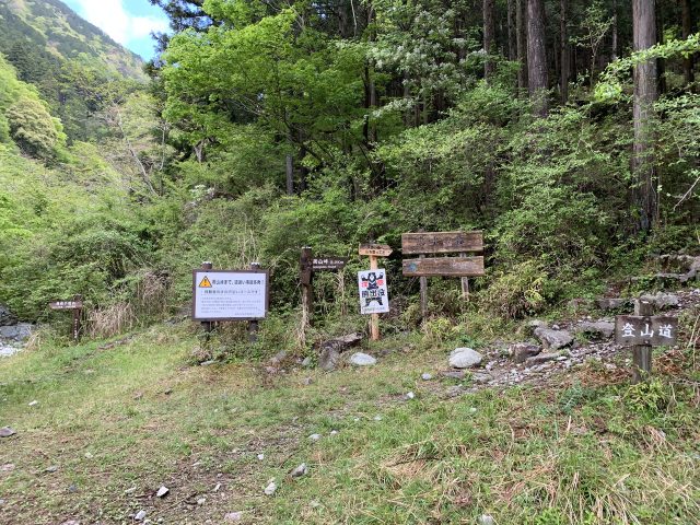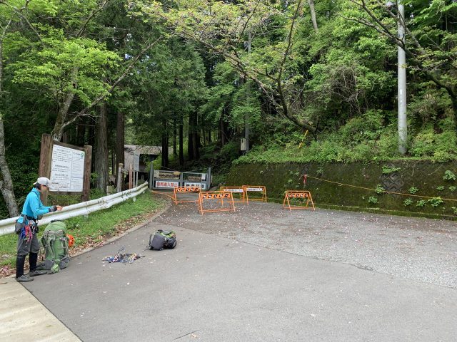 玄倉林道に到着。歩行者も通行止めの標識が設置されている。釣り師だろうか、デポの荷物がおかれていた。