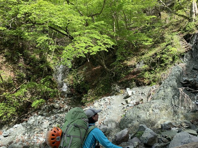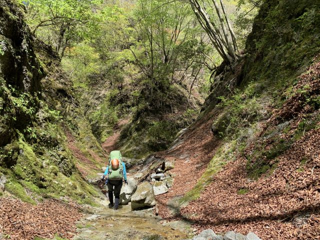 寄沢沿いをしばらく行くと右に登山道が出てくる。堰堤越えの為に高度を稼ぐのが泊りの荷物で少しつらい。