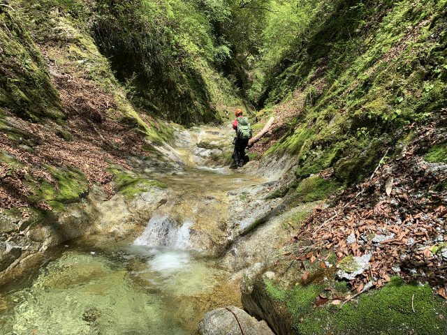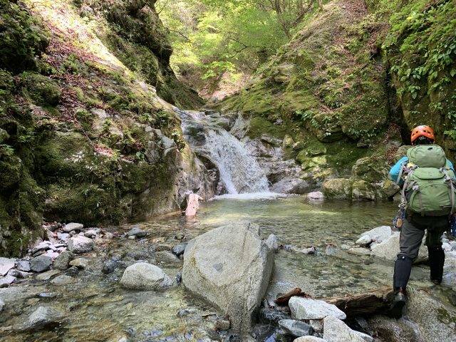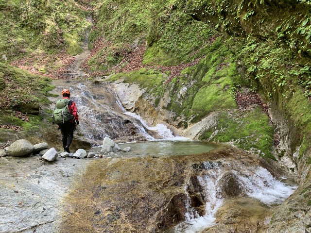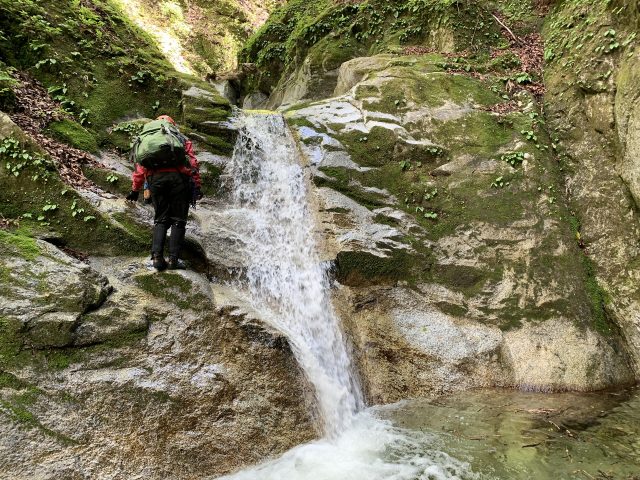 そこを越えると早速、2m滑滝。釜の水が透明で美しい。左をへつって取りつき水流をまたぎ右を登る。