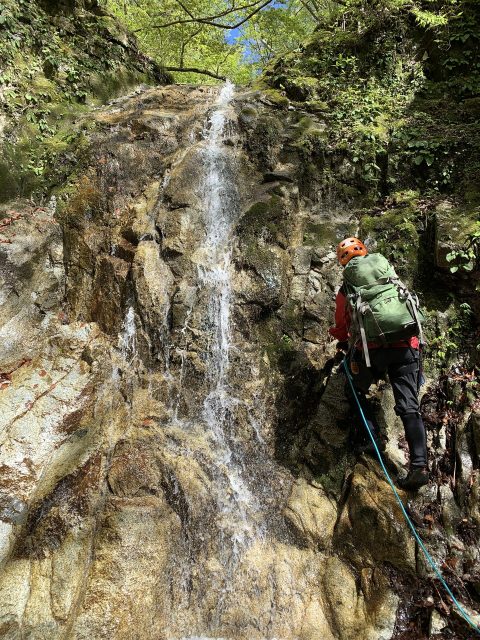 その先すぐの5m滝は唯一ロープを出して右側を登る。