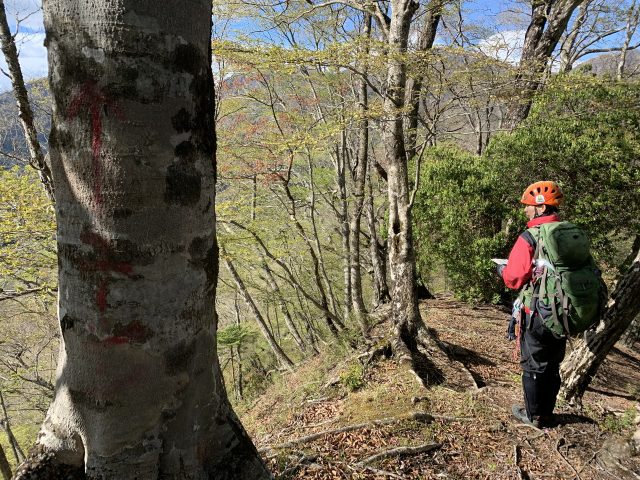 オガラの頭の分岐で左の尾根を行くか、右の尾根に入るか迷うが、木にユーシンと大きくマークされている右の尾根が歩きやすそうなのでチョイス。