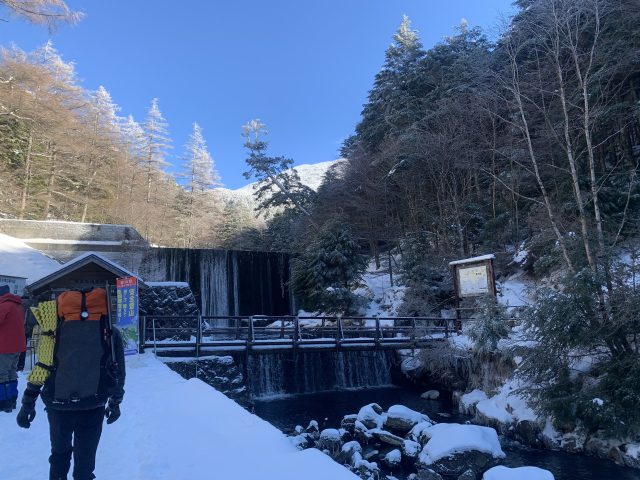 茅野駅から渋の湯行のバスに乗り込む。全員座れる程度の混み方だが前日に積雪があったようで途中チェーンを付けたため20分程度遅れて到着。身支度を整えて出発する。橋の手前でアイゼンを装着する。