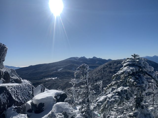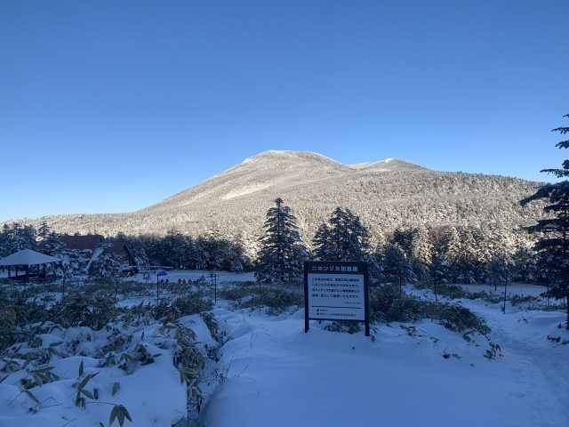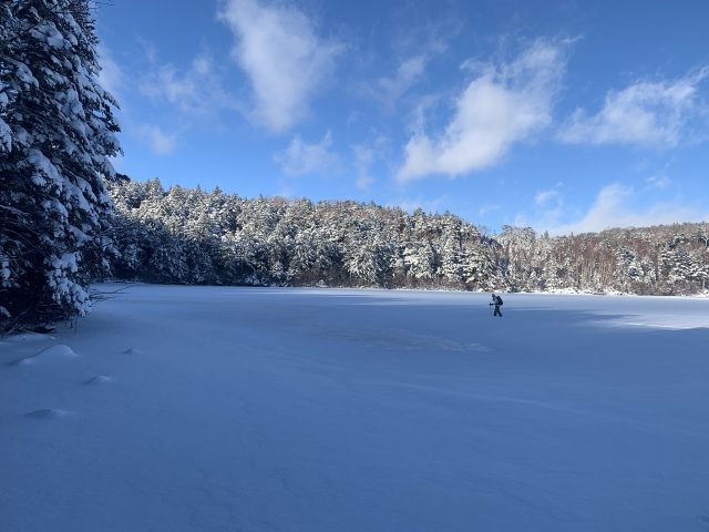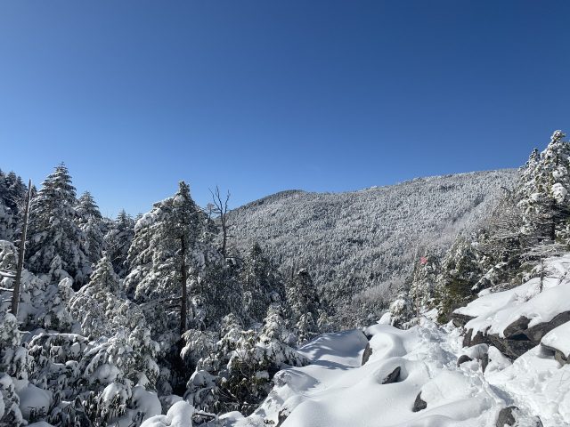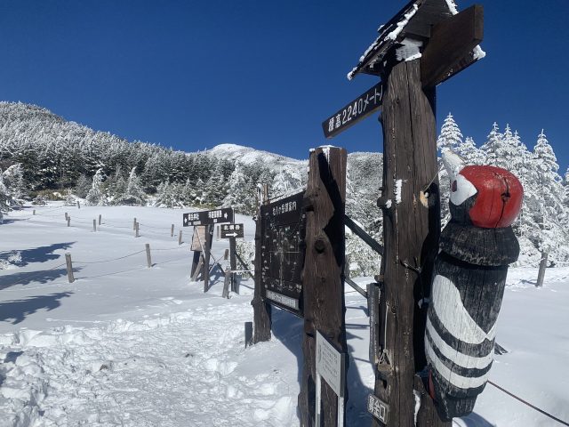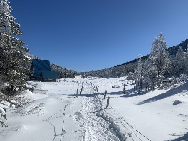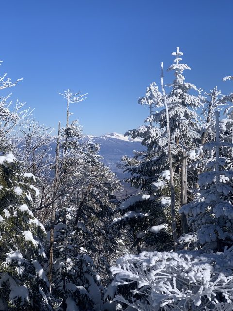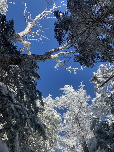 雲一つない快晴で木々は雪をまといなかなかの景色。積雪は30cm程度だが、しっかり歩かれれているのでワカンは不要だ。