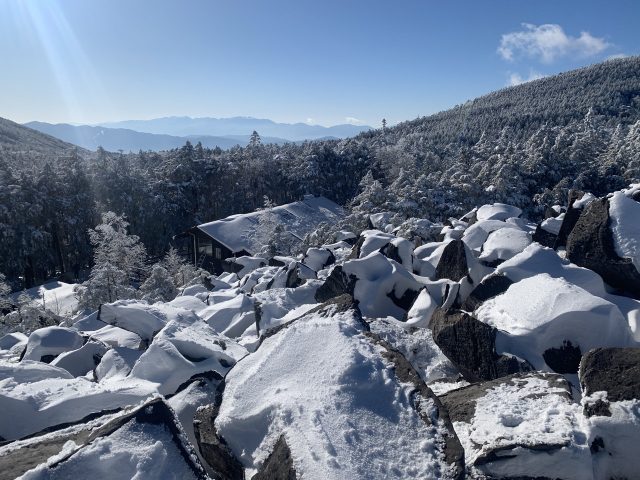 ロープウェイで山麓駅へ7分。雪はほとんどついていない。11時代のバスに乗れたので、途中蓼科温泉 小斉の湯に立ち寄りゆっくりして、帰京した。