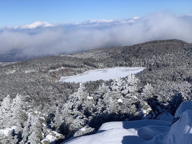 白駒池方面。完全結氷しているようだ。若干雲が湧いている。