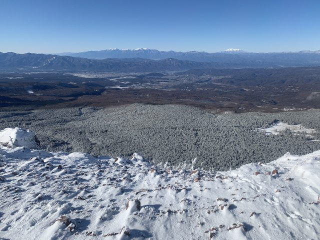 茶臼山中腹の展望台から茅野の町と中央アルプスと乗鞍岳を臨む。樹氷になっている所との境界がはっきりしていて面白い。
