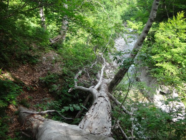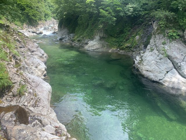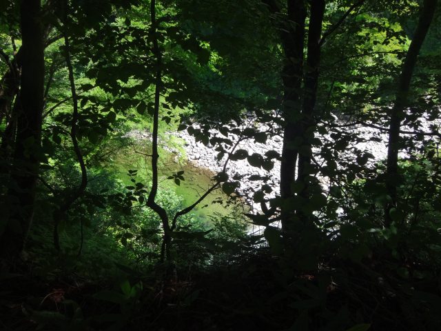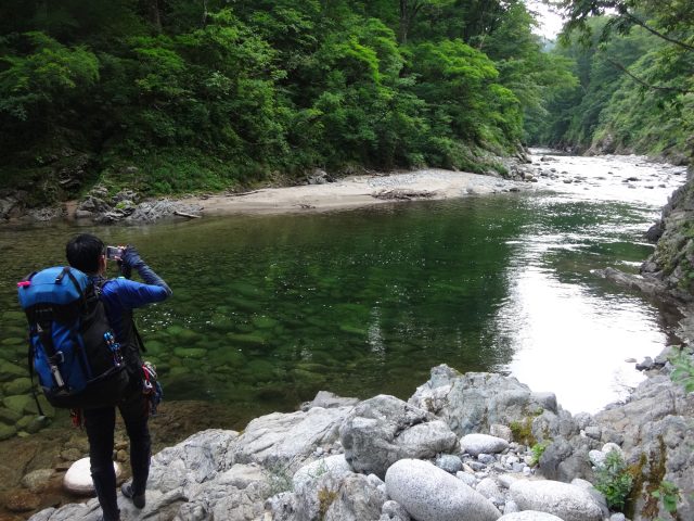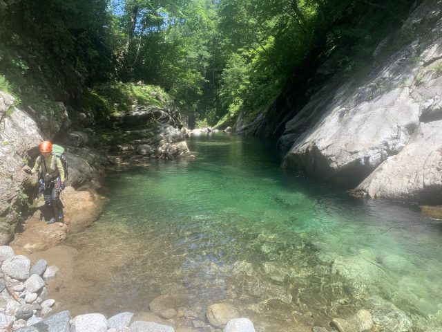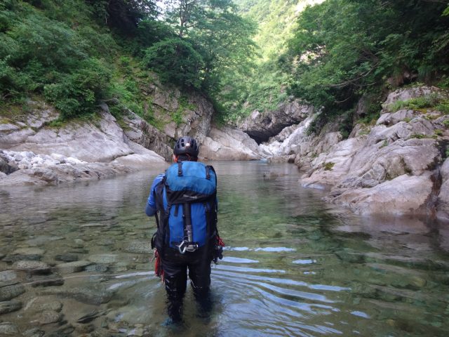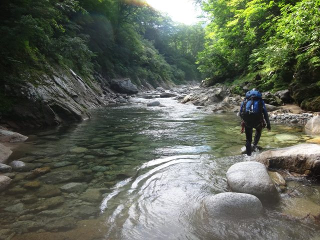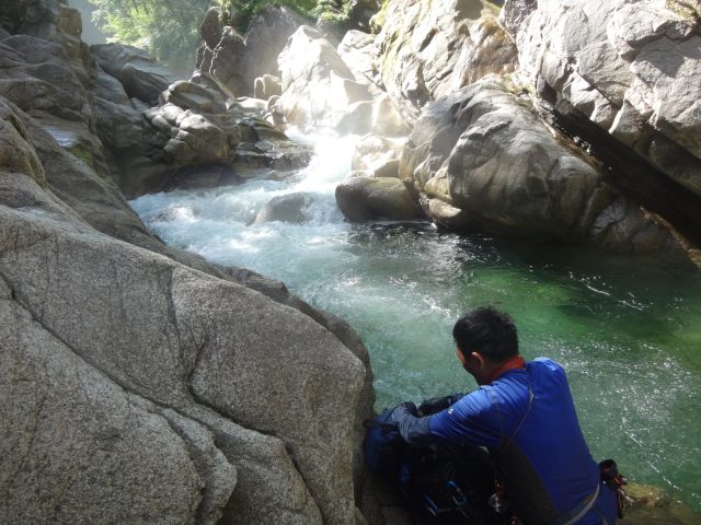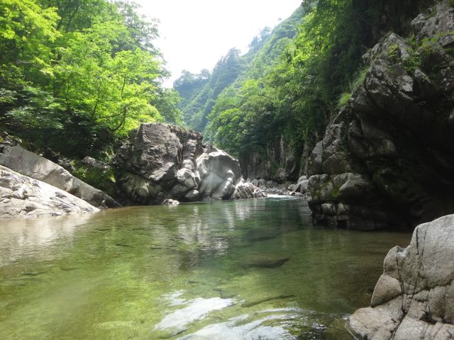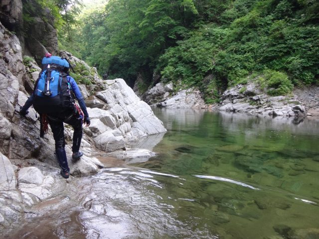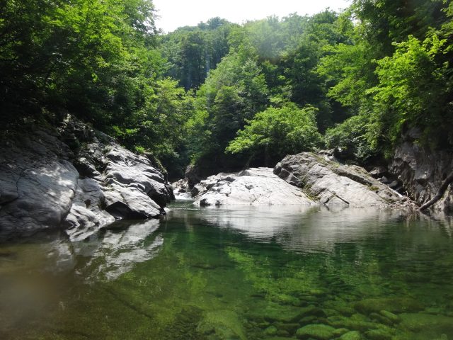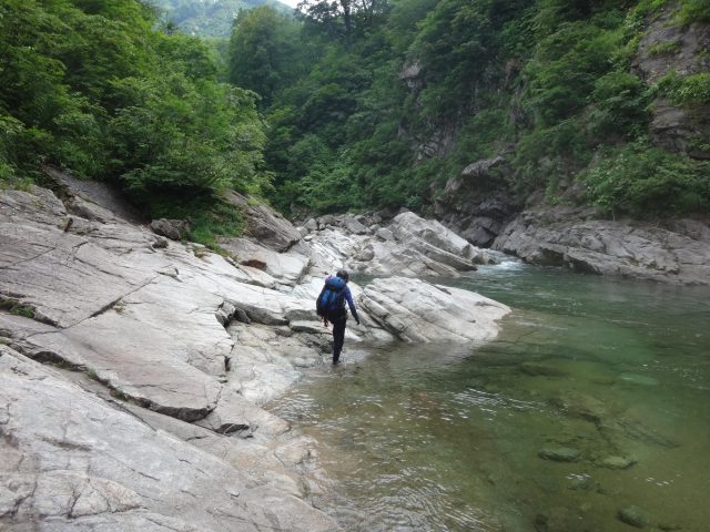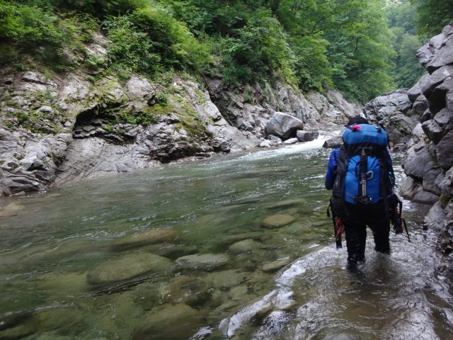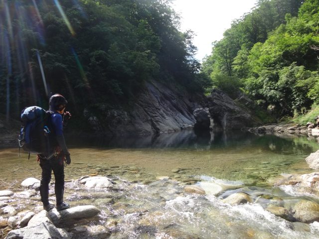 河原はなくなり川幅は少し狭くなる。へつりや浸かったりして通過。再び穏やかになるが栃ノ木沢出合でプールのようになり流れが狭まる。といっても見た目は穏やか、激流ではない。流れが速いところを避けて右の岩壁の末端から深い所に降りワンポイントの泳ぎで通過できた。
