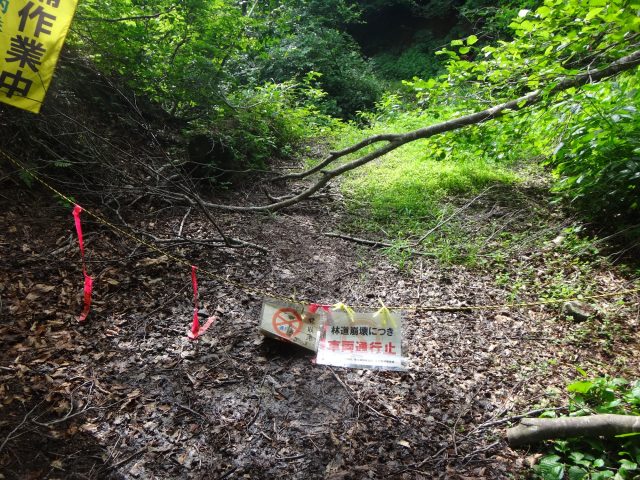 高安沢を過ぎた先の小沢手前に、林道崩壊のため車両通行止めのトラロープが張ってある。ここまで車が入ってくることは可能。途中2台の車が駐車してあった。
