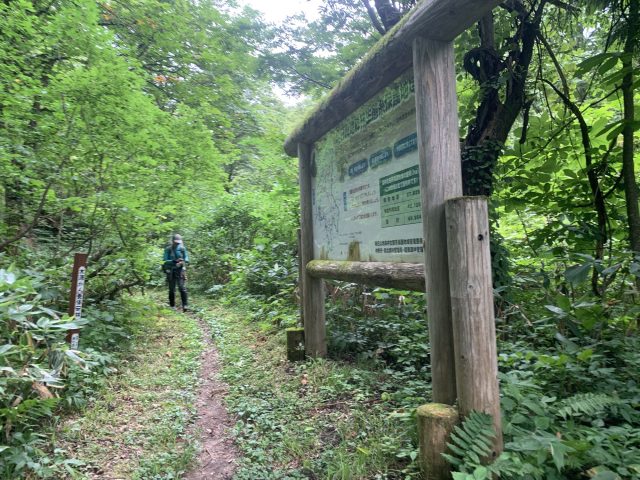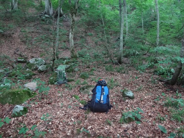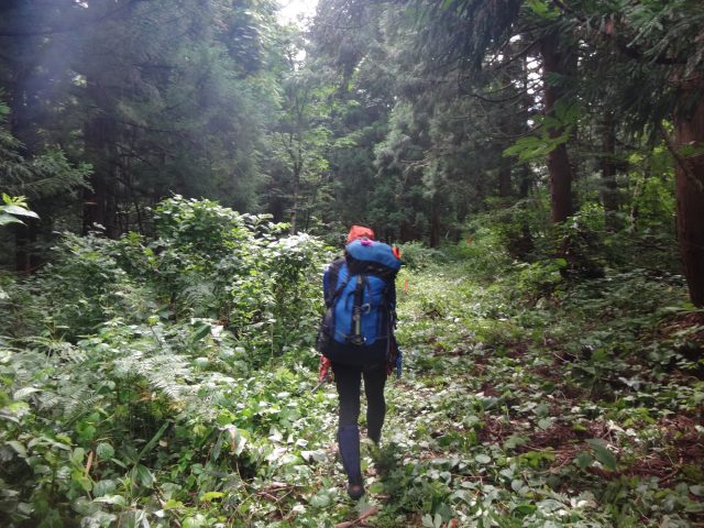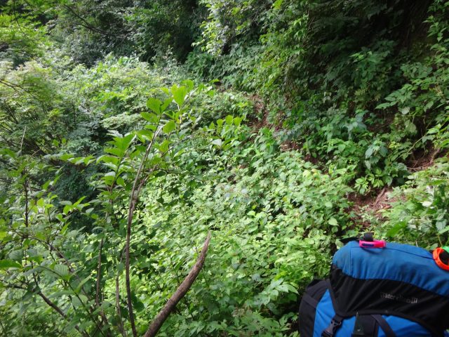 風が通らず、とにかく暑くてペースが上がらない。熱中症になりそうなので、小さな沢を横断する度に水分補給と顔を洗い、濡らした手ぬぐいを首筋に充てたりして体を冷やす。1日目が一番大変だった。
