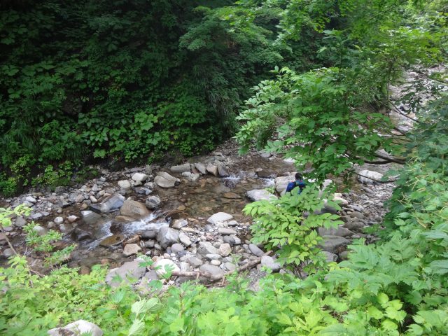 途中で岩屋沢出合から下ってきた釣り師のお兄さんに出会う。