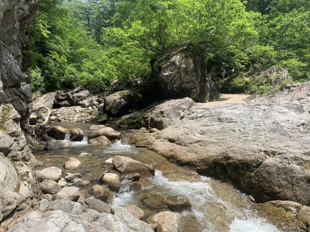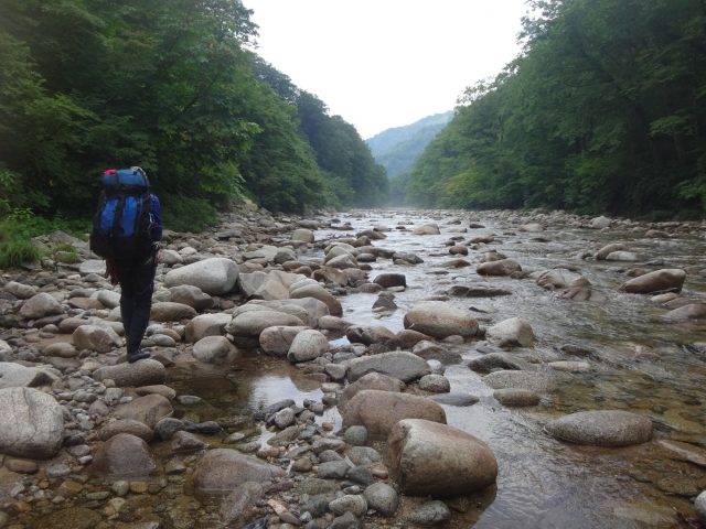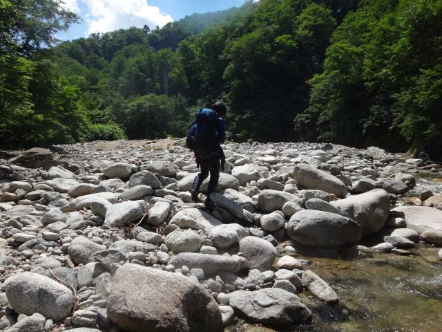 岩屋沢出合に着くと、昨年泊まった砂地のテンバは跡形もなく、岩がゴロゴロしている。1年でこれほど変わるとは。
