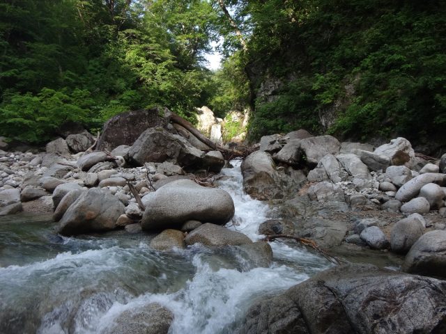 しばらくは河原が続く。芝倉沢出合の少し先で休憩していると中俣沢を遡行する予定という茅ヶ崎山岳会の3人パーティがやってきた。横沢を下降してきたが結構大変だった、今日は平七沢出合まで行くとのことで我々を追い越していった。