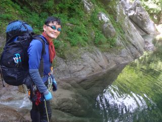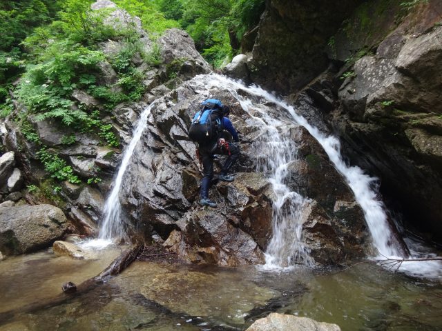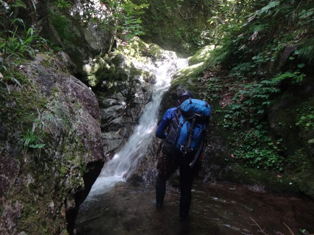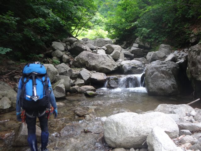 ザックピストンで正面の岩まで行く。そこからは足がつき左側を進むと、右壁奥に隙間があるのが見える。小滝の前を横切り、隙間から空身で這い上がった。