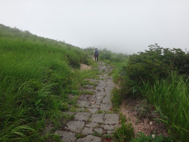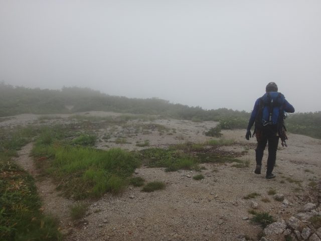 10分ほどで天狗角力取山山頂、その先の土俵で昼食とする。ガスに覆われ周りの景色は見えない。風に吹かれて涼しいのは最初だけで、汗に濡れた体は強い風によってどんどん冷やされていく。カッパを着る。