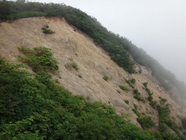 道があったと安心したものの、木を掴みながら急な斜面をトラバースする状態になり、小ルンゼを横切る所で足が止まる。よく見るとトラロープがついていてリーダーは通過したが、私には危険と思い斜面を登って巻くつもりで一旦上に上がる。