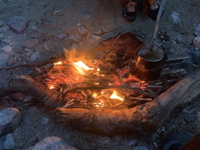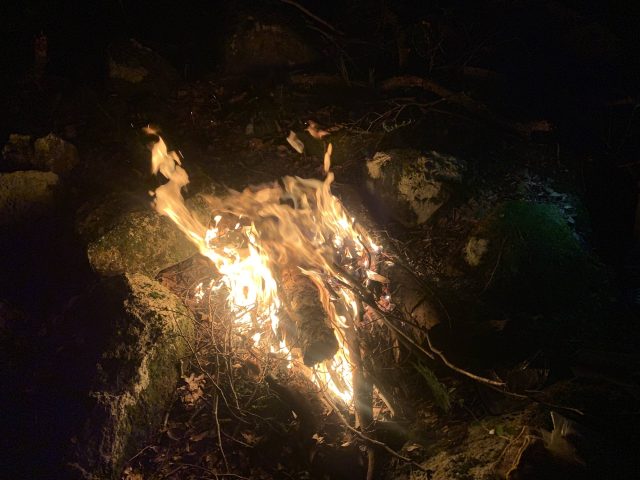 夜の気温が高く、焚き火にあたっていると暑い。台風の影響で風が強く、風向きもころころ変わり落ち着かないが、最後に盛大な焚き火で締めくくる。