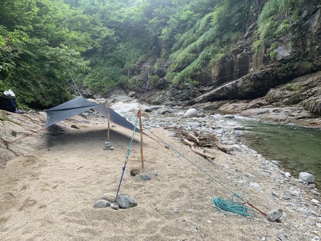 タープを張って、薪を集める。時間があるので釣りに出掛ける。枝沢や茶畑沢出合の釜まで行ってみたが魚の影も形も反応も何もない・・・。