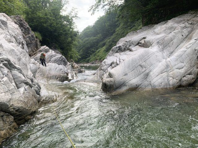 続く2段7m滝も巻いて、懸垂下降で滝上に降りる。