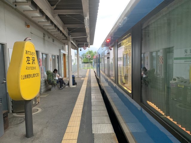 駅のベンチでお疲れ様の乾杯。風に吹かれながら、今回の山行を振り返る。
