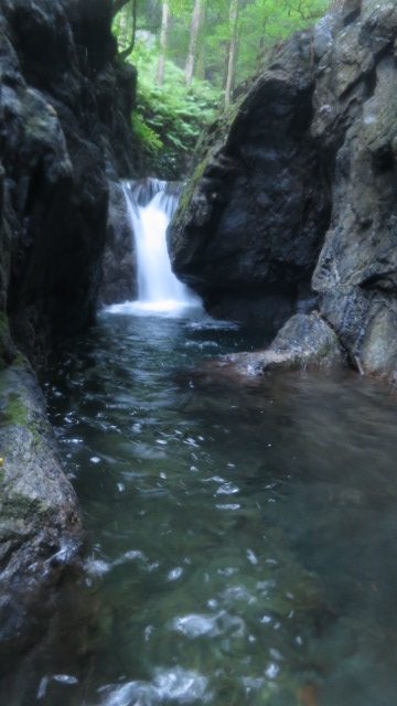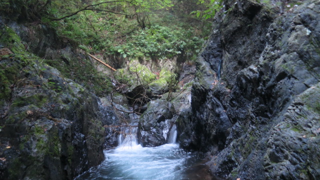 ゴルジュはここ以外にも数か所現れて楽しませてくれます。川幅が狭く、人の訪れも無いので夏の間はクモの巣の猛攻にあいますがこれを木の枝で払いながら進むのが醍醐味です!クモの巣払いに疲れたら沢に目を向ければ透明感あふれる水や釜や小滝、ゴルジュが癒してくれます。どの滝も巻かないで登れるし、釜や淵も腰まで浸かれば突破できるし(泳ぎたければもちろんそれも楽しい!)怖いと感じる個所はほとんどないです。
