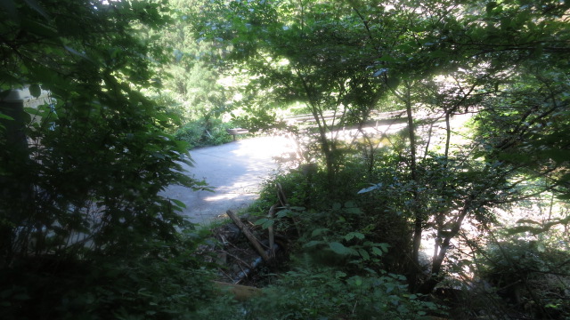 お盆休みの混雑を避け6:00に入渓。朝から良く晴れて今日も酷暑となること確実ですが、御岳山までは涼しい沢を歩けるから楽しみです。寸庭橋の袂から多摩川を100mくらい遡ったあたりが越沢との出合いになります。出合いからすぐに左から寸庭川の滝が掛かります。滝の上部には寸庭橋から御岳山裏参道へ伸びる山道の橋が横切っています。この道はすぐ上流で流れを跨ぎ右上の松の木尾根へと続きます。橋を過ぎると左に荒れたワサビ田があり、なんと早朝から数名の方がワサビの収穫を行っていました。(*多摩川出会いからこのワサビ田辺りまで沢に沿って作業道が付いているのでそちらを進むのがおすすめです)ワサビ田を過ぎると作業道は一旦不明瞭になりますのでここから入渓すのが良いでしょう。間もなく壊れた橋の橋台が現れゴルジュ入口の目印となります。
