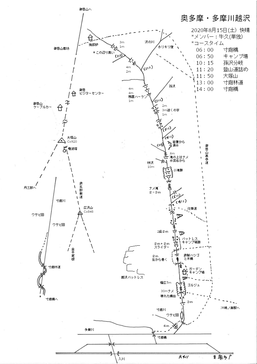 Co325でガーデンキャンプ場、Co345でバットレスキャンプ場跡で登山道へとエスケープも取れます。その後もいくつかの滝を超え、本流を忠実に詰め御岳山の宿坊が集まるあたりに出ましたが残念なことに最後の方でゴミが目につき始め、沢水に生活感の匂いも混ざってきました。はっきり言って幻滅なので途中から枝沢を大塚山方面へルートを取るほうがいいと思います。遡行後は御岳ケーブカーの山頂駅を通過するので良い休憩場所になります。ここで下山ルートを御岳か梅郷か丹三郎か寸庭にするか色々選べます。今回、下山は大塚山から鉄五郎新道を少し下り右にある寸庭川を下りましたが、この沢はワサビ田が多くみられましたが酷く荒れていたのでとても歩きにくかったので早々に作業道から寸庭林道へ逃げて下山となりました。寸庭下山なら鉄五郎新道をそのまま下るか広沢山から金平尾根を下ったほうが楽しそうです。