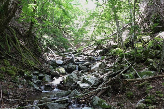 水流が現れた後簡単な小滝が続き、その後水が涸れると藪に遮られることもなく登山道に行き着く。