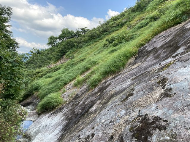 それなりに勾配があるもののグリップが良いので歩き易く楽しめました。ふとスラブの脇に目を向けると灌木や草付きがすべて下方に寝ています。岩床も水線がトイ状に抉れてたり、ポットホールもあちこちに見られます。この地方の石質と積雪量によるものなのか?一体どのくらいの年月がこの渓相を作ったのか?興味が尽きません。出来ることなら雪が積もったここの景色も見てみたいと思いました。最後のスラブ約200mは右のルンゼから登り、途中で灌木帯を突き抜けて左の主流に戻りました。ルートを見出してくれたリーダーに感謝です。スラブの上部は眺望が素晴らしく、遡行してきた沢筋や尾根が眼前に広がり充実感に浸れました。それにしても道路はもちろん、送電線など人工物が全く視界に入らない景色は圧巻でした。