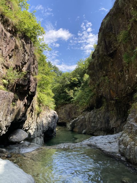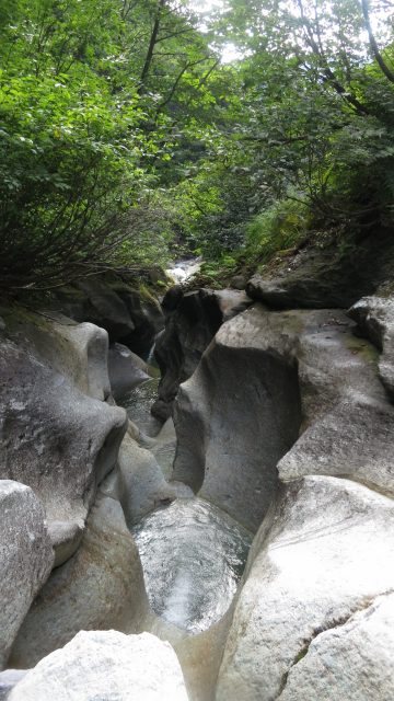 谷が狭くなると川原が無くなり岩床や大岩が目につくようになりスラブ滝も表れ始めます。ところどころ釜を持つ段差では積極的に水に入りクールダウン!これが実に気持ち良かった。