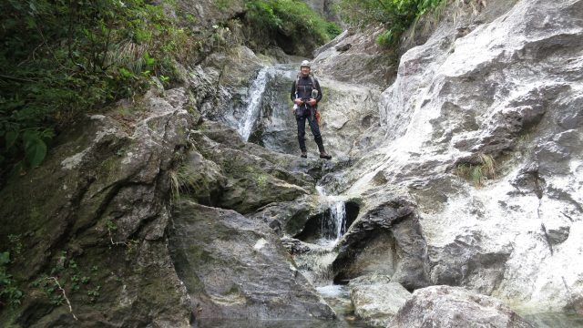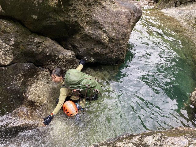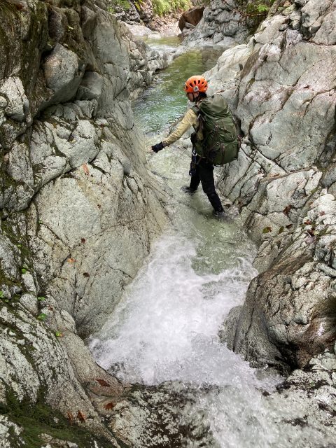 倉谷沢へ続く枝沢はスラブではなく巨岩ゴロゴロの面白い渓相で、所々ロープを使いながらぐんぐん下りました。やがて落差のある滝が現れ、懸垂が難しいとなるとリーダーの藪好きが発揮され、巻きルートを探ってくれました。Co430で左から倉谷沢が合わさるといよいよゴールを意識してもいい感じになりましたがCo350付近で下降ルート最難関の滝が待っていました。滝上から覗いてみると中段まで尻セードで行き、そこから飛び込めそうな気もしましたが巻きルートファインディングの勉強にもなるので右岸から大高巻きしました。ここでもリーダーのルーファイセンスが光り、ベストなルートで巻くことが出来ました。滝下で休憩がてら釜で泳がせてもらいましたが深くてとても面白かったです。この滝が今回の沢旅のフィナーレとなりました。