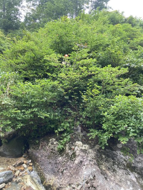 6:10に室谷川と倉谷沢出合いに車をデポし、入渓点まで約1時間の林道歩きですがこの林道沿いにはクルミが沢山自生していて路面には何やら大きな糞が沢山!なんだか嫌な予感がすると思ったのもつかの間、約100m前方にクルミを食べる親子熊が居ました。こちらが早めに気が付いたので離れた距離から良く観察することが出来ました。子熊の動きがもっさりしていて無邪気でとてもかわいかったです。出だしから野生の懐に分け行くのだという実感が湧きました。