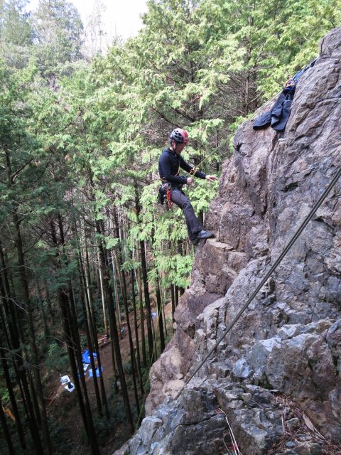 各メニューは、まず岩壁隣の山斜面で注意点・手順を確認し、その後岩壁に移動し実施した。