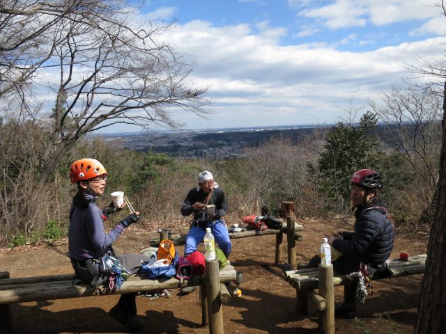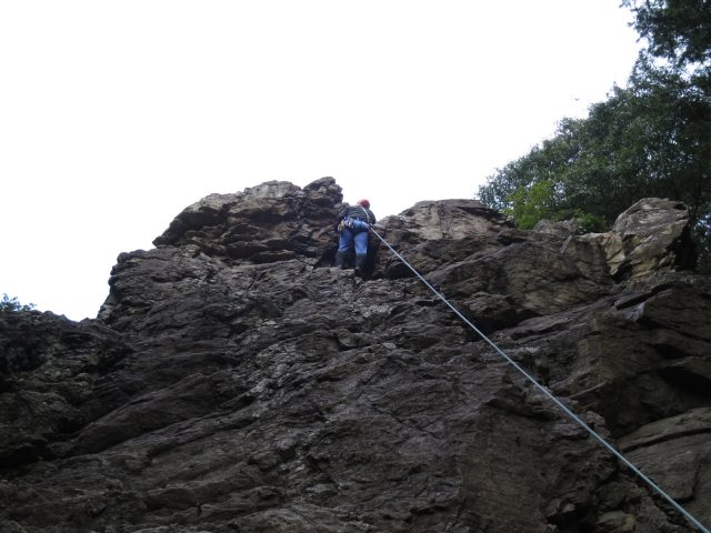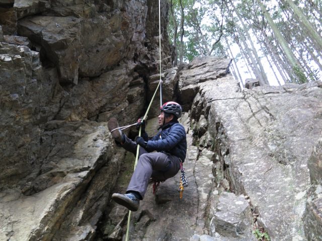 その後、男岩に移動し空中懸垂からの登り返しを想定した練習を一人ずつ練習してから中央ルートにトップロープを垂らし登攀とビレイの練習をした。ロワーダウンはクライマーとビレイやーの息が合わないと危ない。ビレイヤーはクライマーがロープに体重を預けたのを感じてからゆっくりロープを送らないと危険だ。