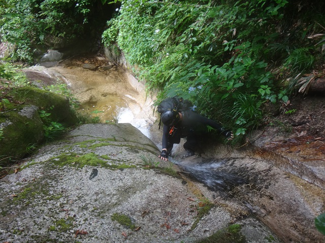左のルンゼから巻き岩壁の下をトラバース、懸垂をセットし滝上の様子を覗いてみると、両岸スラブのゴルジュとなっており、先に登れなさそうなCS滝が見える。戻って別の巻きルートを見てみるが時間がかかりそうなので、手前の二俣に戻る。