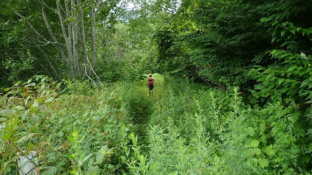藪尾根で何回か違う尾根に入ってしまい、方向修正する。途中、目の前でガサガサ!と音がし、熊と思われる動物に遭遇するが、向こうがびっくりして逃げていってくれた。最後は小ボラ沢側の林道に出る。