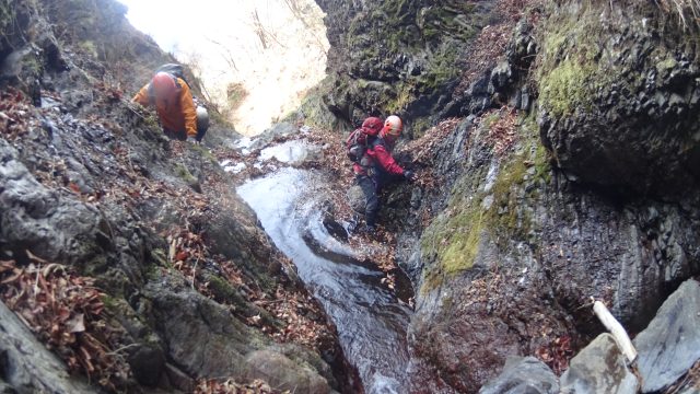 Co520で左から日陰沢が出合います。(*前記ガイドブックは標高が異なっているような気がします) この二俣には作業小屋跡があります。沢はこの先で一旦伏流となります。再び水流が戻ると倒木が目立つようになりますがそれほど酷くなくて歩きにくい事はありません。Co610で右俣が出合いますが枯れていました。その先で再び倒木が目立つ箇所がありますがやはり大したことはありませんでした。2度目の倒木区間を抜けると植林帯が終わり沢が明るくなります。この沢が面白いのはここからでした。両岸に岩壁が迫り雰囲気がガラリと変わります。沢床も砂利が無くなり岩盤の上を水が流れるようになり傾斜もきつくなってきます。落差のある滝が増えてロープを出す機会も増えます。水温が高い季節だとなんてことのない水たまりもこの時期は濡れたくないのでコース取りも慎重になりコース取りの面白さも加わりました。