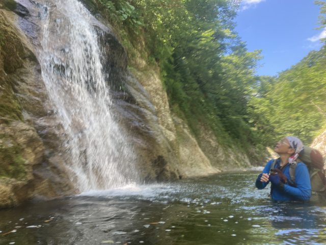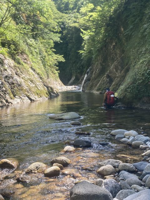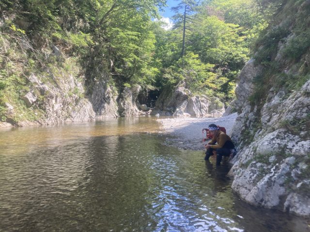 今日も朝から気持ちのよい天気です。沢の雰囲気は昨日と同じような様相で、淵の中を歩いたり河原歩きです。昨日と比べると水深は浅く泳ぎが少なめです。