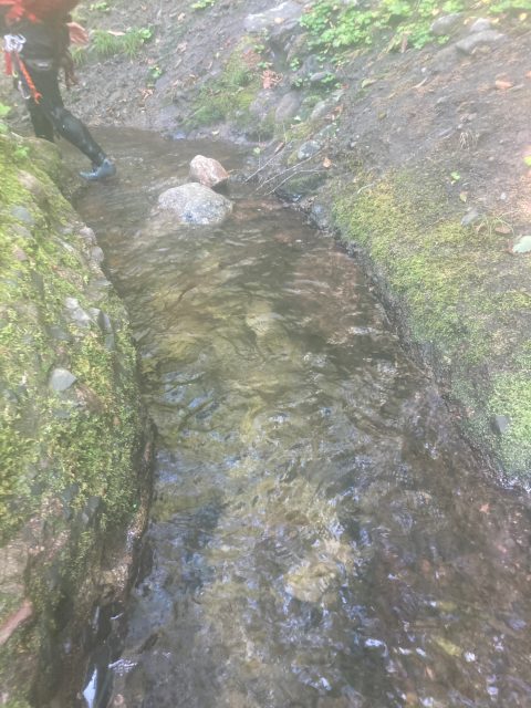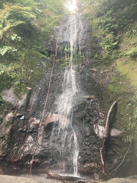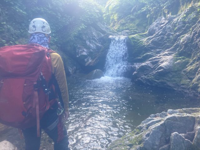 仕方がないので少しだけ登り返して、左岸尾根を少し巻き懸垂下降で沢に戻りました。二俣出合を少し越えたあたりに7m、15mの2つの滝を懸垂下降。