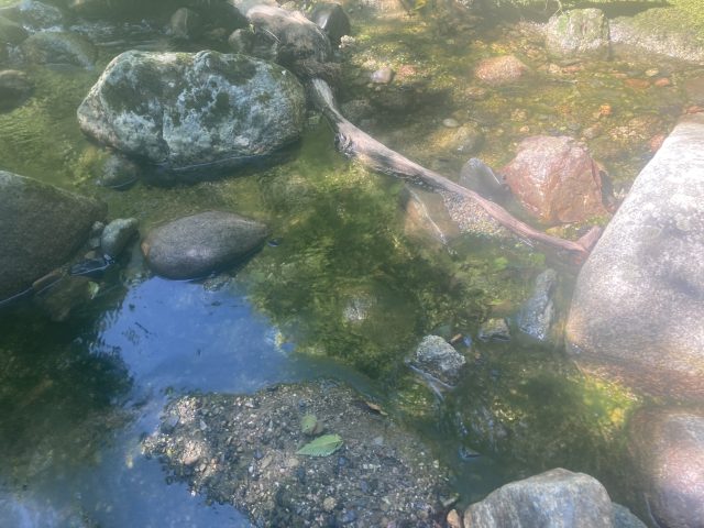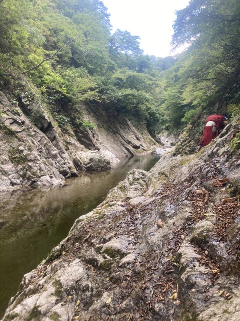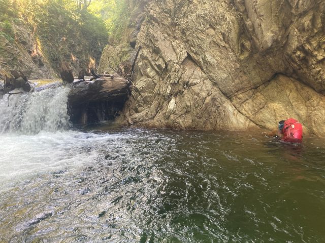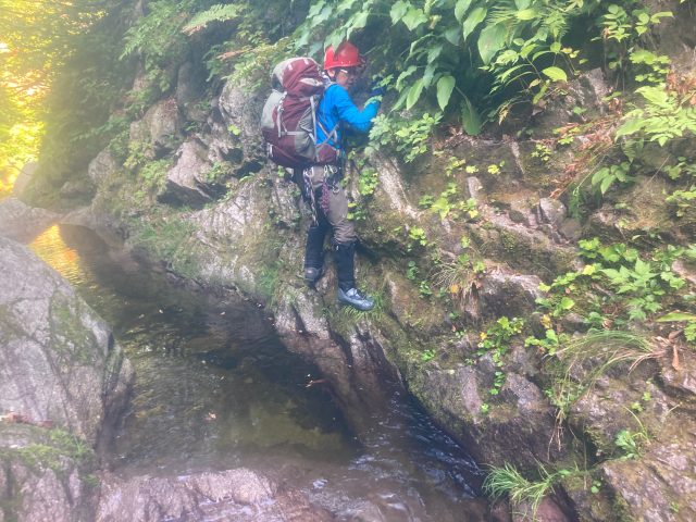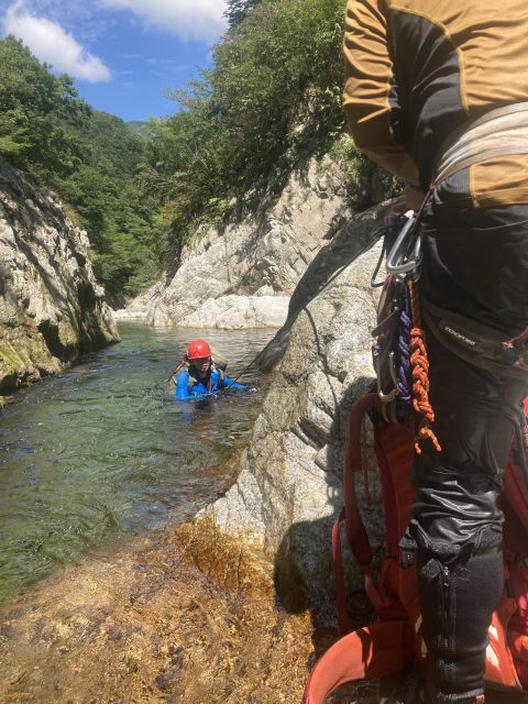 岩を乗り越えたり、ロープ確保してもらい泳ぎました。足がつきそうでつかないところは泳いでへつる、何度もあってへつりの練習になりました。手と足のホールドのとりかたなど教えてもらい勉強にもなりました。