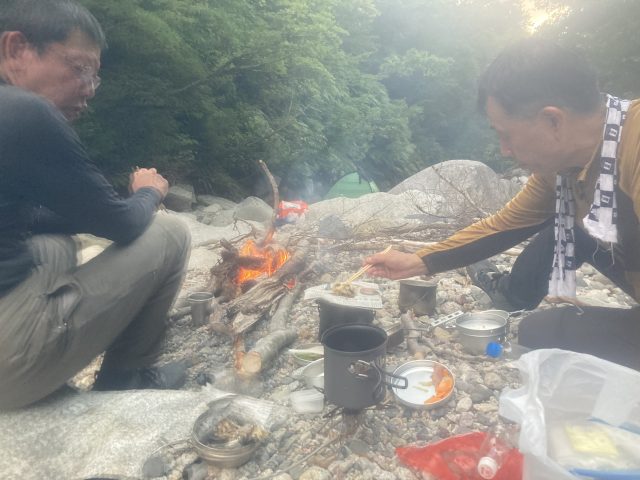 イワナはから揚げにして余すところなく有難く頂きました。とっても美味しかったです!2日間とも天候に恵まれたなと思い、星空を眺め、焚火にあたりながらぼーっとする至福の時間です。初めての2泊山行でみなさんについていけるのか心配でしたが、明日は五郎三郎沢を遡行して下るだけです。そう思うと少し名残惜しい気もしてきました。