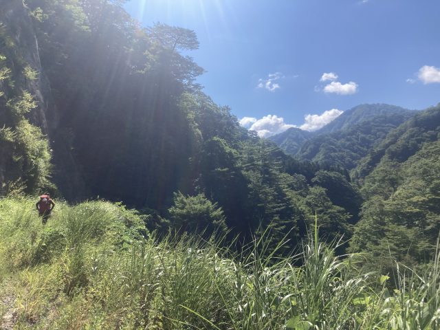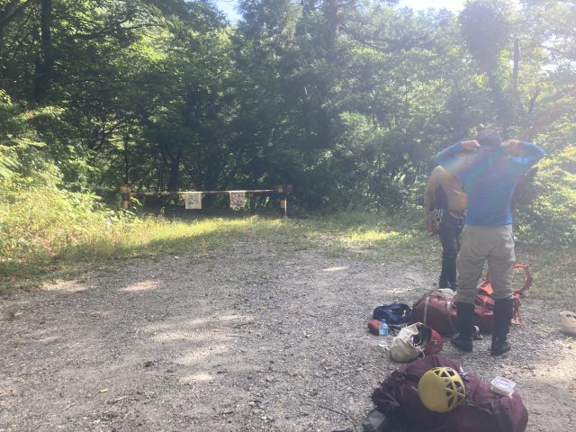 今年の夏山行は、石田リーダー計画の女川遡行2泊の計画に参加させてもらいました。前日夜に出発し、前泊地の道の駅「関川」に到着したのは日付が変わったころ、ずいぶん遠いところまできた感じがします。軽く祝杯をあげて明日に備えて就寝しました。翌朝、女川林道を車で走り車止めゲート手前のスペースに車を停めさせてもらいました。車から降りると早速アブの襲来。アブが多いとの事前情報だったので厚手の長袖を着込んではみたものの、、とても暑かったです。(結果、長袖を着込んでも上から刺されます!)石田さん、古巻さんは慣れたもので、意に介せず淡々と準備していました。