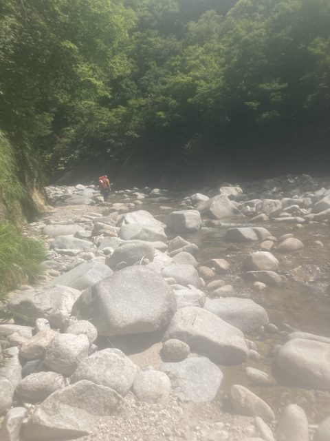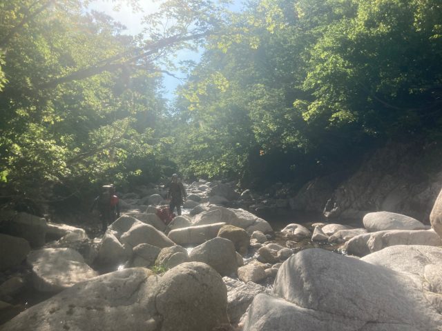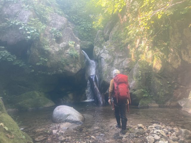 今日も快晴。3日間天候に恵まれました。朝食に古巻さんが現地調達したミズの茎をいれたお味噌汁を作ってくれました。起き抜けの体に染みます、ありがとうございました!最終日は、五郎三郎沢を遡行し舟渡集落のほうへ下山し、その後はタクシーにきてもらい車の回収をします。五郎三郎沢を詰めると蕨峠の径にぶつかるので、そのまま下山もしくは径沿いに流れる越沢川を沢下降する予定です。前半は平坦で標高がなかなか上がりませんが、次第に少しづつ標高が上がっていきます。大きな滝はなく小滝がいくつかある程度で順調に遡行していきます。