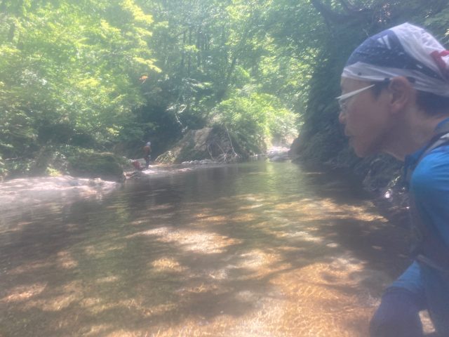 矢木沢との出合のすぐ手前で入渓して、しばし休憩。腰まで沢に浸かりクールダウン、水温は生ぬるくゆっくりと体の熱が下がっていくのを感じてホっとします。