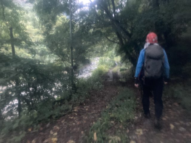 前夜、道の駅みなかみで仮眠をして早朝出発。スタート地点の林道はヒルがすごいとのことで、道の駅で沢靴&スパッツを装着してヒルファイターぶっかけました。スタート地点の谷川温泉の広い駐車場に停めさせてもらい、行程が長いので6時前には装備を整えて歩き始めました。歩きやすい林道で快適に歩けて体も温まって良い感じです。よく見ると地面にヒルがウネウネしていましたがヒルファイターのおかげかやられずに済みました。。。