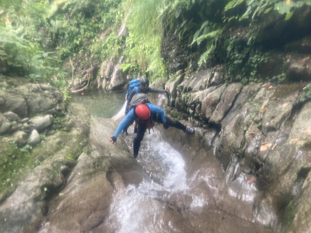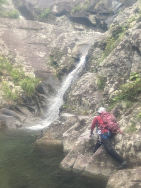 二俣を過ぎて、登れる滝や豪快な滝が続く。畑Lがメンバーの技量に合わせロープをだしてくれて安心して登れました。