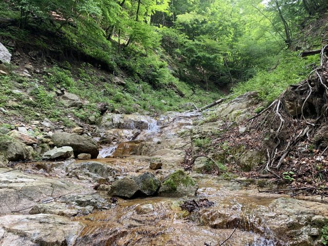 林道の被害からも予想していたが、Co820左岸支流も出合いは押し流されてきたガレから始まった。期待できないのはともかく、落石等が起こりやすい沢だったら嫌だなと思いながら進むと、ガレの先は以外にも階段状の滑がきれいだった。