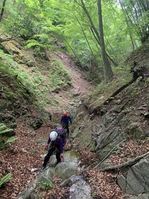 その先は大きな岩で滑が埋まったりまた少し滑になったりする。3Mの滝が一つあったがどんな滝だったか記憶にない。Co980辺りから沢は狭くなる。Co1040から1050まで倒木アスレチック状態。当然楽しくない。Co1100で水が今にも枯れそうになったため休憩しながらA班に交信するも、応答なし。受信できないであろう場所だったが、後で聞けば「交信するの忘れてた」とのこと。シュールすぎる。