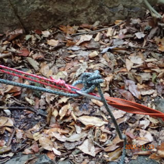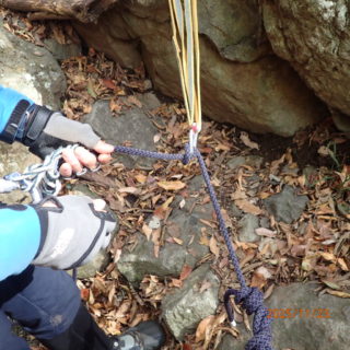 橋の両サイドからロープを交互に下してまずは空中懸垂。着地後は早速エイトカンを持ち出して二人(丸山さん、坂部さん)ともしばらくそのシステムの構築に集中されていました。が、結局うまくいかず今までの方法(シュリンゲ2か所:手と足)で落ち付きました。 丸山さんはいとも簡単にするすると登って見本を見せてくださいました、が私は今回が橋下から橋上までロープを登るのが初めてだったせいと二日酔いの疲れからかヘロヘロ汗だくになってしまいました。本日一番の核心でした。登り上がって訓練終了で道路から登山道経由で泉に戻りました。ご指導ありがとうございました。お疲れ様でした。