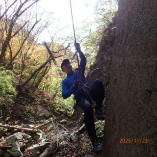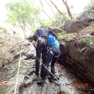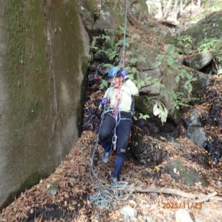 ②さらに沢を登って板立ノ滝で、リードレスキュー(自己脱出、介護懸垂、セルフブレーキングシステム、それからディスタンスブレーキングシステムとディレクションビレイ)を実施しました。 私は未だはっきりを頭に入っていなく所々がとても新鮮に思えました(自己脱出、ディレクションビレイの時)