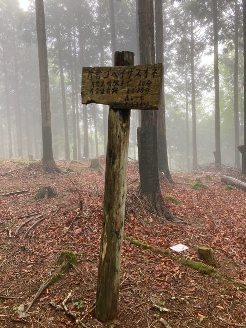 ㏇1425付近で立て看板あり。看板には「片倉ゴヘイザスオネ」と表記されていた。ここから七ツ石山までの尾根の名称だろうか。